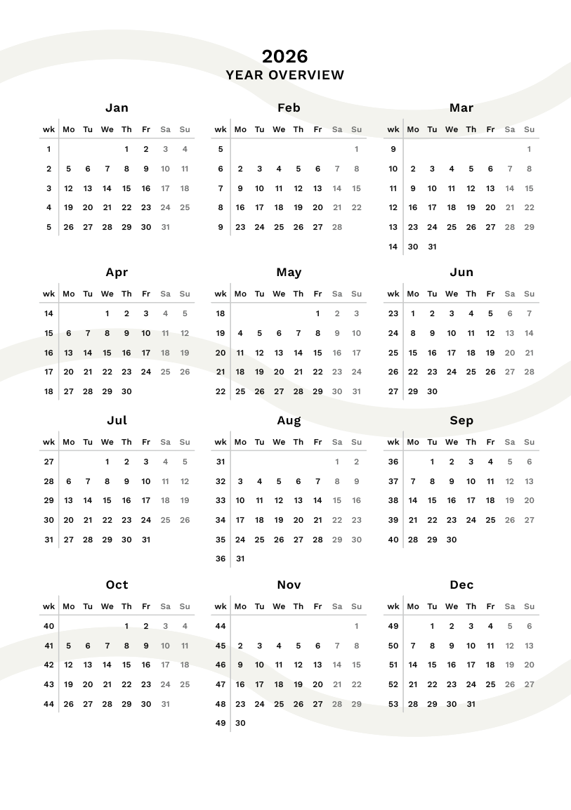 A minimalist two-year overview for calm, intentional planning – designed to bring perspective and clarity to your seasons ahead.